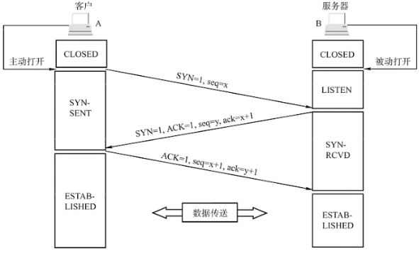 - 第一次握手:客户端发送 SYN 报文,并进入 SYN-SENT 状态,等待服务器的确认