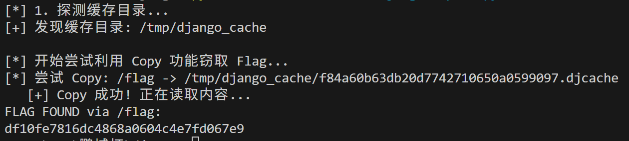 调用 /copy/,把 /flag (源) 复制到 /tmp/django_cache/<MD5>.djcache (目标)。