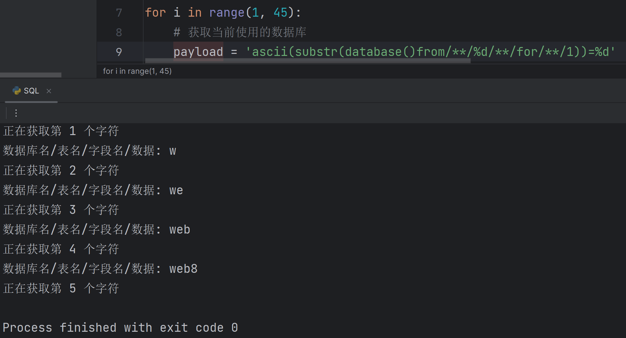 #payload = 'ascii(substr(database()from/**/%d/**/for/**/1))=%d'